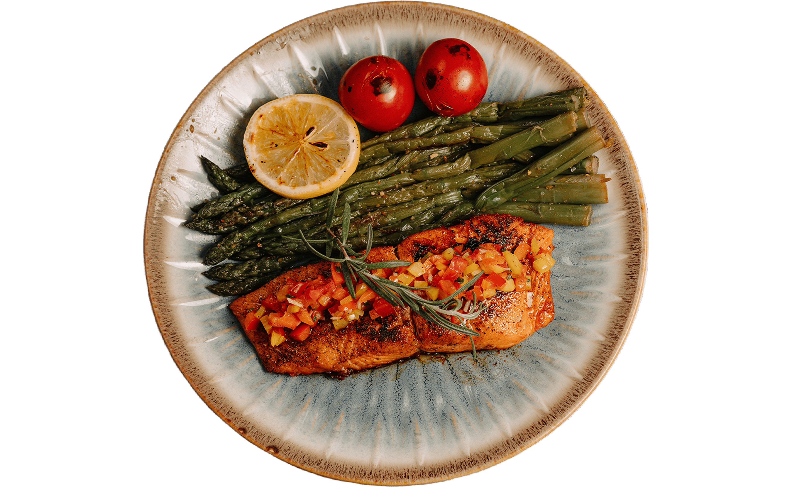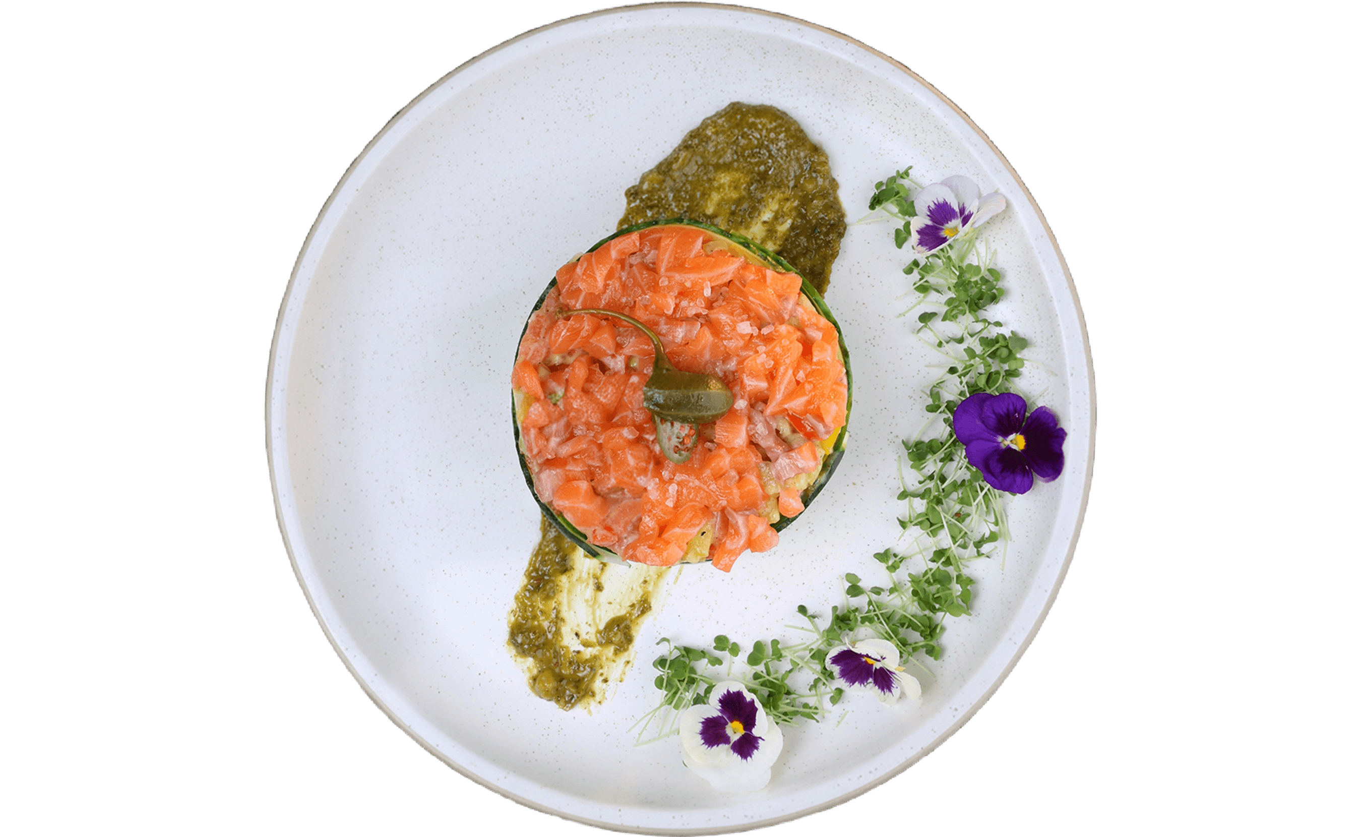 Սաղմոն, թարմ բանջարեղեն, պեստո սոուս